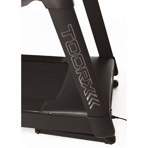 Elegantní, moderní a hlavně výkonný běžecký pás TRX 3500 je modelem z edice trenažérů TOORX Chrono Line Pro. Trenažéry z této řady jsou vhodné nejen na trénink v domácím prostředí, ale díky certifikaci ve třídě S, i pro lehce komerční provoz. Trenažér TRX 3500 je vybaven tichým AC motorem s maximálním výkonem 4,5 PS a běžeckou plochou s nadstandartním rozměrem 164 x 60 cm. Na konzoli se prostřednictvím 7 bíle podsvícených LED displejů zobrazují všechny důležité tréninkové hodnoty. Programová nabídka zahrnuje celkem 9 programů s různou úrovní intenzity, trénink si tak uživatel může přizpůsobit na míru svoji aktuální kondici. Pás je navíc vybaven integrovaným Bluetooth modulem, využít tak lze i kompatibilních tréninkových aplikací Kinomap nebo Zwift (předplatná nejsou v ceně).