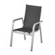 Křeslo stohovatelné, stabilníy hliníkové konstrukci stříbrné barvy, elastický a odolný textilní výplet v antracitovém odstínu, hliníkové područky