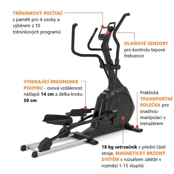 magnetický eliptický neboli crossový trenažér, 10 programů včetně srdečním pulsem řízeného programu, Bluetooth, široký rozsah nastavení 15ti stupňů zátěže, 18 kg setrvačník, délka kroku 50 cm, vnitřní velice úzká rozteč nášlapu 7 cm, paměť pro 4 osoby, stabilní a pevný rám, komunikace s aplikací KETTMAPS pomocí Bluetooth připojení, velký a velmi dobře čitelný LCD displej, nosnost 130 kg