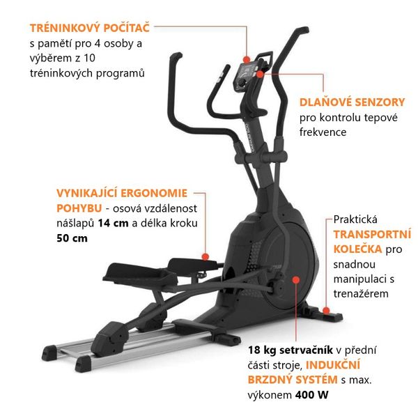eliptický ergometr s indukční brzdou, 10 programů, regulace výkonu 25-400W, Bluetooth rozhraní, délka kroku 50 cm, velice úzká vnitřní rozteč nášlapu 7 cm, paměť pro 4 osoby, stabilní a pevný rám, komunikace s aplikací KETTMAPS, velký a velmi dobře čitelný LCD displej, 18 kg setrvačník, hmotnost 75 kg, nosnost 130 kg