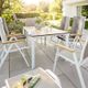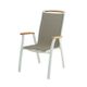 Křeslo stohovatelné, stabilní hliníková konstrukce v bílé barvě, elastická a odolná umělá tkanina v krémově šedém odstínu, týkové područky