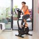 - Vybavení trenažéru. Pohodlné fitness sedlo s možností rychlého výškového nastavení, polohovatelná ergonomická řídítka, samonastavovací řeménkové pedály, držák na tablet nebo smartphone, kolečka pro manipulaci (umístěná vpředu), mechanismus vyrovnávání nerovností podlahy (vzadu).