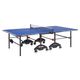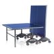 venkovní stůl, sklopitelný, modrá hrací plocha, antireflexní povrch desky, výkyvná kolečka s brzdou, síťka součástí stolu, držák na pálky a míčky, snadná montáž, vyroben v Německu