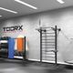 profesionální žebřiny – ribstole s hrazdou, zesílená ocelová konstrukce 75 x 75 mm, 5 příček s šířkou 1050 x ø32, multiúchopová hrazda o šířce 1080 mm, 2 J-háky, možnost rozšíření o další příslušenství, kotvení do zdi, nosnost 120 kg,