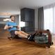 designový veslovací trenažér, lehce sklopitelný se snadnou manipalací po místnosti, plynulý, komfortní a tichý vodní brzdný systém s možnosti nastavení 5ti stupňů odporu, Bluetooth rozhraní, nastavitelné opěrky nohou, pevná a stabilní konstrukce, hmotnost 33 kg, nosnost 150 kg